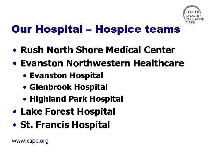 Our Hospital – Hospice teams • Rush North Shore Medical Center • Evanston Northwestern Healthcare • Evanston Hospital • Glenbrook Hospital • Highland Park Hospital • Lake Forest Hospital • St. Francis Hospital www. capc. org