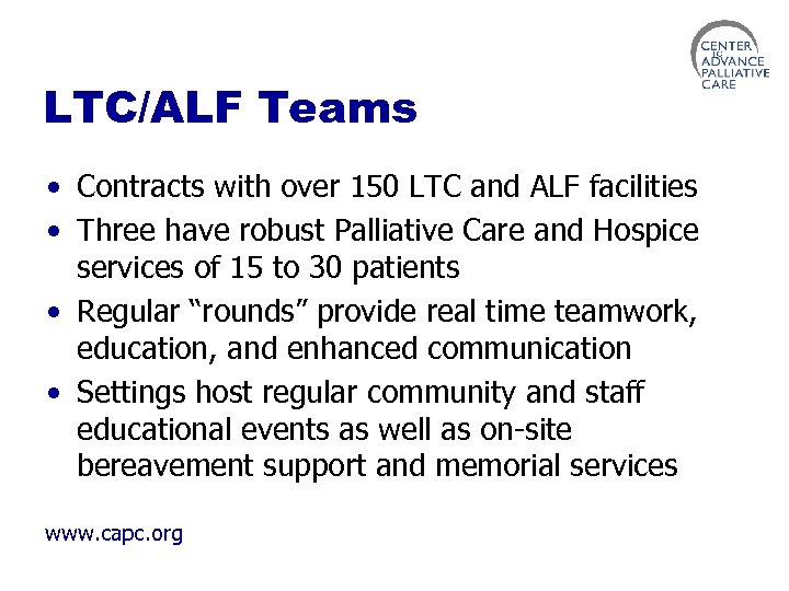 LTC/ALF Teams • Contracts with over 150 LTC and ALF facilities • Three have robust Palliative Care and Hospice services of 15 to 30 patients • Regular “rounds” provide real time teamwork, education, and enhanced communication • Settings host regular community and staff educational events as well as on-site bereavement support and memorial services www. capc. org