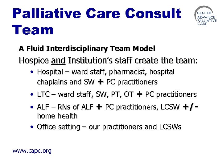 Palliative Care Consult Team A Fluid Interdisciplinary Team Model Hospice and Institution’s staff create the team: • Hospital – ward staff, pharmacist, hospital chaplains and SW + PC practitioners • LTC – ward staff, SW, PT, OT + PC practitioners • ALF – RNs of ALF + PC practitioners, LCSW +/home health • Office setting – our practitioners and LCSWs www. capc. org