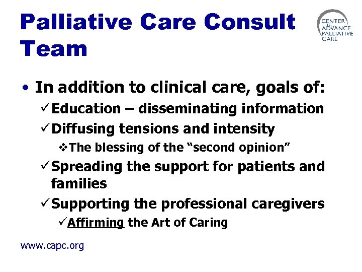 Palliative Care Consult Team • In addition to clinical care, goals of: üEducation – disseminating information üDiffusing tensions and intensity v. The blessing of the “second opinion” üSpreading the support for patients and families üSupporting the professional caregivers üAffirming the Art of Caring www. capc. org
