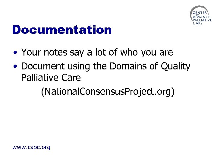 Documentation • Your notes say a lot of who you are • Document using the Domains of Quality Palliative Care (National. Consensus. Project. org) www. capc. org