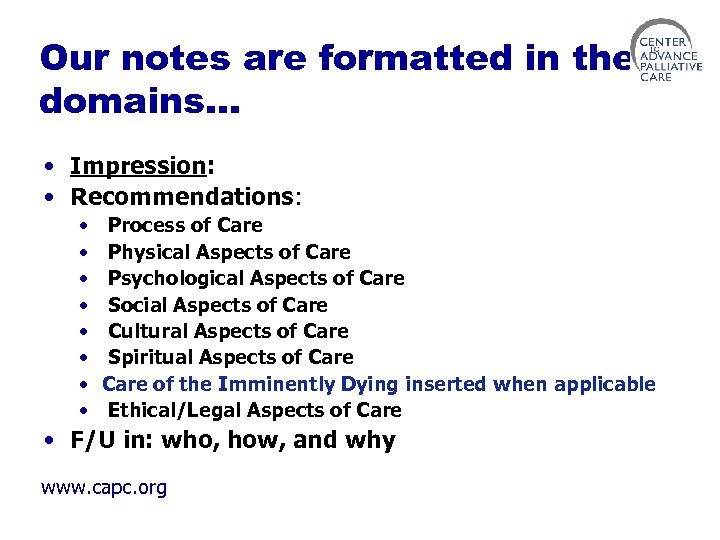 Our notes are formatted in the domains… • Impression: • Recommendations: • • Process of Care Physical Aspects of Care Psychological Aspects of Care Social Aspects of Care Cultural Aspects of Care Spiritual Aspects of Care of the Imminently Dying inserted when applicable Ethical/Legal Aspects of Care • F/U in: who, how, and why www. capc. org