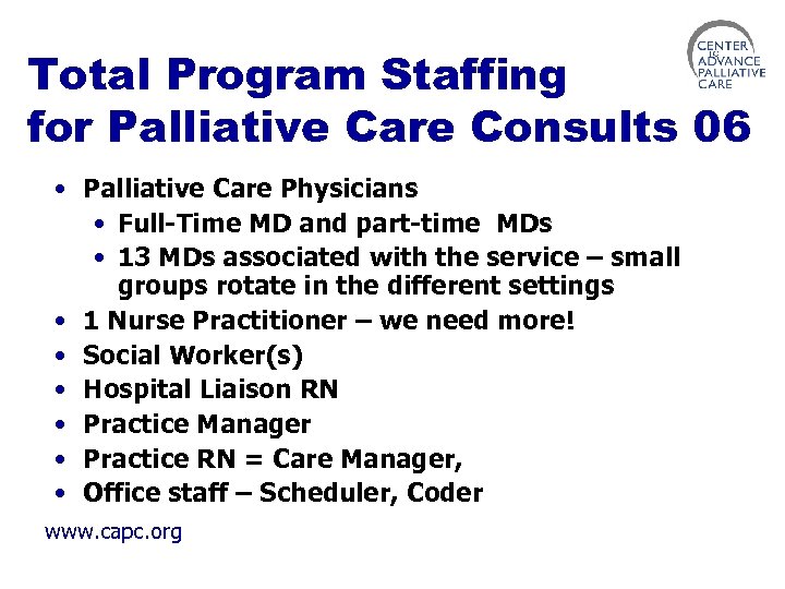 Total Program Staffing for Palliative Care Consults 06 • Palliative Care Physicians • Full-Time MD and part-time MDs • 13 MDs associated with the service – small groups rotate in the different settings • 1 Nurse Practitioner – we need more! • Social Worker(s) • Hospital Liaison RN • Practice Manager • Practice RN = Care Manager, • Office staff – Scheduler, Coder www. capc. org