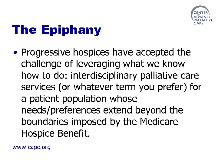 The Epiphany • Progressive hospices have accepted the challenge of leveraging what we know how to do: interdisciplinary palliative care services (or whatever term you prefer) for a patient population whose needs/preferences extend beyond the boundaries imposed by the Medicare Hospice Benefit. www. capc. org