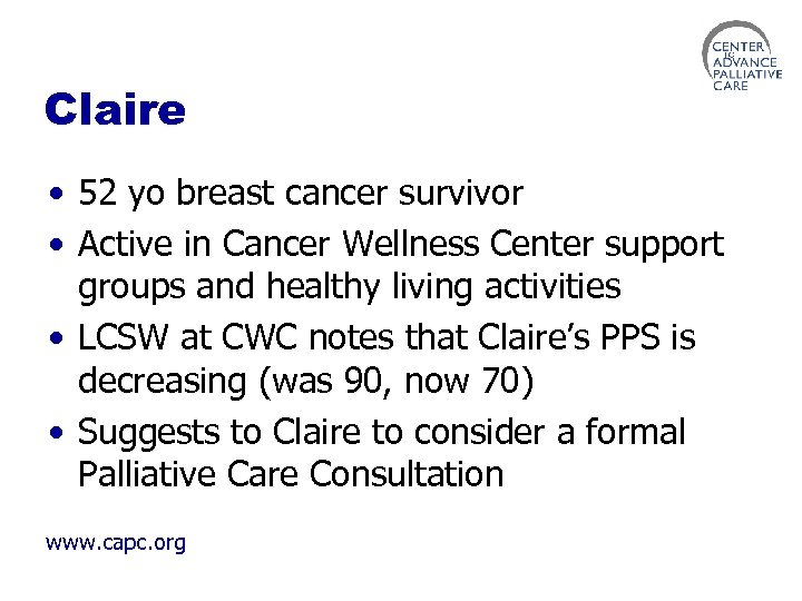 Claire • 52 yo breast cancer survivor • Active in Cancer Wellness Center support groups and healthy living activities • LCSW at CWC notes that Claire’s PPS is decreasing (was 90, now 70) • Suggests to Claire to consider a formal Palliative Care Consultation www. capc. org