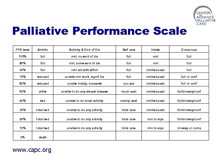 Palliative Performance Scale PPS level Ambltn Activity & Evid of Dis Self care Intake Conscious 100% full nml, no evid of dis full nml full 90% full nml, some evid of dis full nml full 80% full nml act with effort full nml/reduced full 70% reduced unable nml work, signif dis full nml/reduced full or conf 60% reduced unable hobby, housewk occ ass nml/reduced full or conf 50% sit/lie unable to do any wk; ext disease much asst nml/reduced full/drowsy/conf 40% bed unable to do most activity mainly asst nml/reduced full/drowsy/conf 30% total bed unable to do any activity total care nml/reduced full/drowsy/conf 20% total bed unable to do any activity total care min to sips full/drowsy/conf 10% total bed unable to do any activity total care min to sips drowsy or coma 0% death www. capc. org