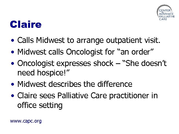 Claire • Calls Midwest to arrange outpatient visit. • Midwest calls Oncologist for “an order” • Oncologist expresses shock – “She doesn’t need hospice!” • Midwest describes the difference • Claire sees Palliative Care practitioner in office setting www. capc. org
