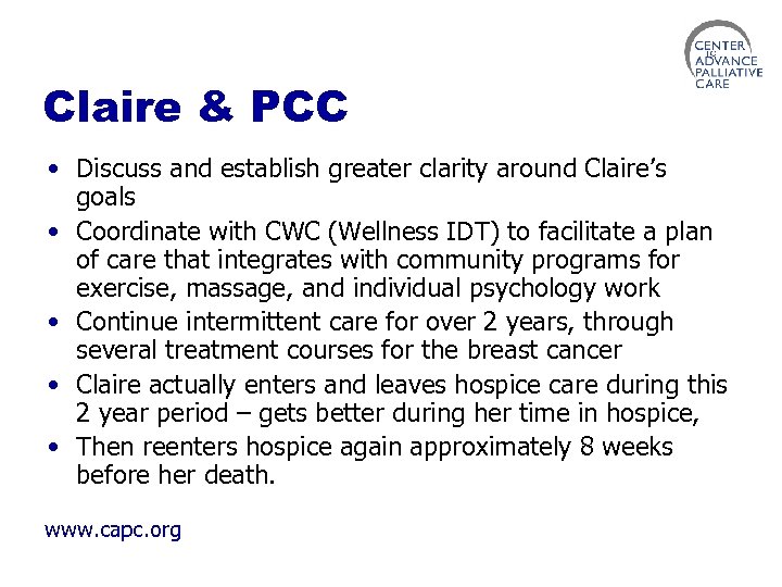 Claire & PCC • Discuss and establish greater clarity around Claire’s goals • Coordinate with CWC (Wellness IDT) to facilitate a plan of care that integrates with community programs for exercise, massage, and individual psychology work • Continue intermittent care for over 2 years, through several treatment courses for the breast cancer • Claire actually enters and leaves hospice care during this 2 year period – gets better during her time in hospice, • Then reenters hospice again approximately 8 weeks before her death. www. capc. org