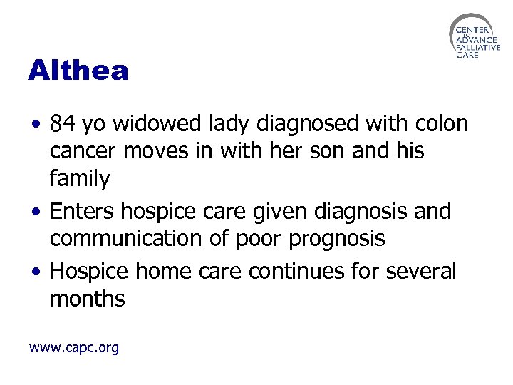 Althea • 84 yo widowed lady diagnosed with colon cancer moves in with her son and his family • Enters hospice care given diagnosis and communication of poor prognosis • Hospice home care continues for several months www. capc. org