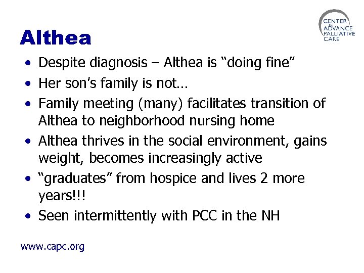 Althea • Despite diagnosis – Althea is “doing fine” • Her son’s family is not… • Family meeting (many) facilitates transition of Althea to neighborhood nursing home • Althea thrives in the social environment, gains weight, becomes increasingly active • “graduates” from hospice and lives 2 more years!!! • Seen intermittently with PCC in the NH www. capc. org