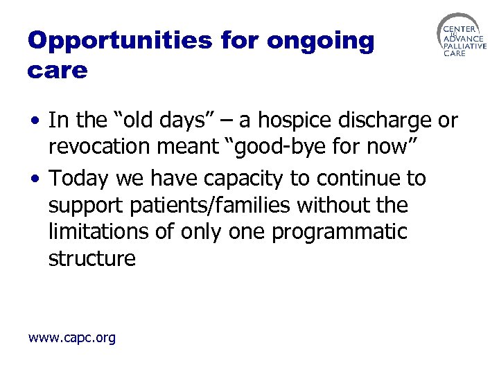 Opportunities for ongoing care • In the “old days” – a hospice discharge or revocation meant “good-bye for now” • Today we have capacity to continue to support patients/families without the limitations of only one programmatic structure www. capc. org