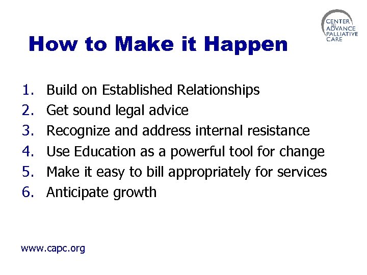 How to Make it Happen 1. 2. 3. 4. 5. 6. Build on Established Relationships Get sound legal advice Recognize and address internal resistance Use Education as a powerful tool for change Make it easy to bill appropriately for services Anticipate growth www. capc. org