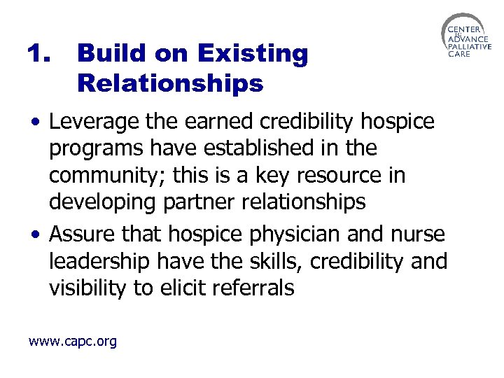 1. Build on Existing Relationships • Leverage the earned credibility hospice programs have established in the community; this is a key resource in developing partner relationships • Assure that hospice physician and nurse leadership have the skills, credibility and visibility to elicit referrals www. capc. org