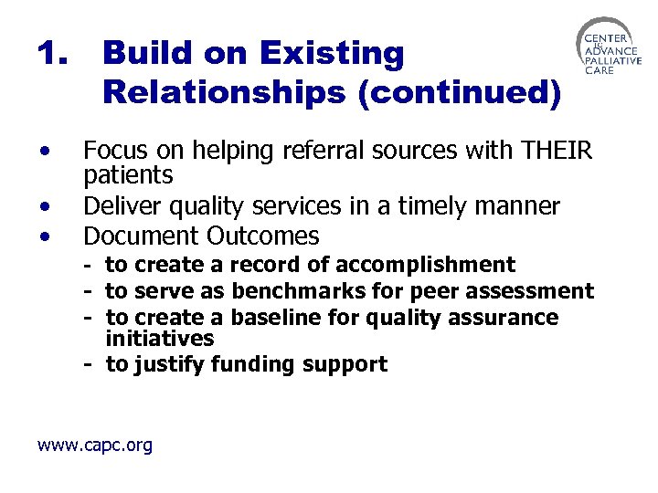 1. • • • Build on Existing Relationships (continued) Focus on helping referral sources with THEIR patients Deliver quality services in a timely manner Document Outcomes to create a record of accomplishment - to serve as benchmarks for peer assessment - to create a baseline for quality assurance initiatives - to justify funding support - www. capc. org