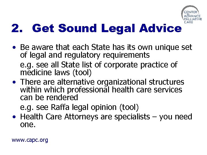 2. Get Sound Legal Advice • Be aware that each State has its own unique set of legal and regulatory requirements e. g. see all State list of corporate practice of medicine laws (tool) • There alternative organizational structures within which professional health care services can be rendered e. g. see Raffa legal opinion (tool) • Health Care Attorneys are specialists – you need one. www. capc. org
