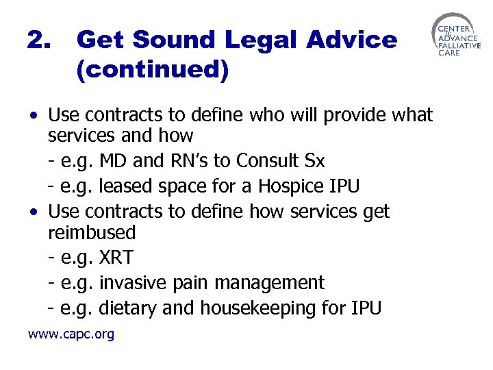 2. Get Sound Legal Advice (continued) • Use contracts to define who will provide what services and how - e. g. MD and RN’s to Consult Sx - e. g. leased space for a Hospice IPU • Use contracts to define how services get reimbused - e. g. XRT - e. g. invasive pain management - e. g. dietary and housekeeping for IPU www. capc. org