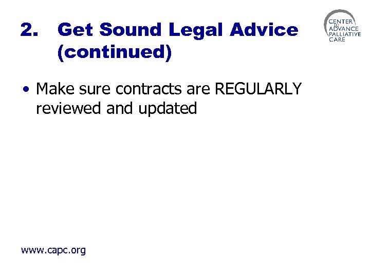 2. Get Sound Legal Advice (continued) • Make sure contracts are REGULARLY reviewed and updated www. capc. org