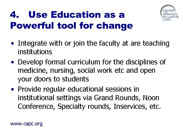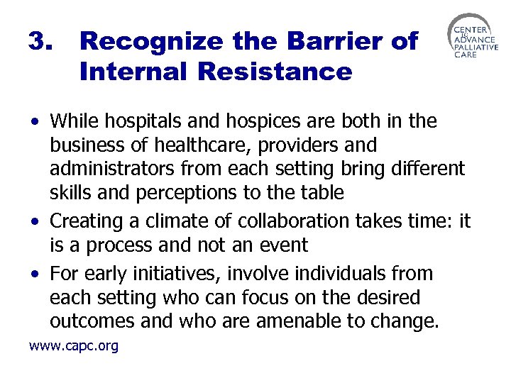 3. Recognize the Barrier of Internal Resistance • While hospitals and hospices are both in the business of healthcare, providers and administrators from each setting bring different skills and perceptions to the table • Creating a climate of collaboration takes time: it is a process and not an event • For early initiatives, involve individuals from each setting who can focus on the desired outcomes and who are amenable to change. www. capc. org
