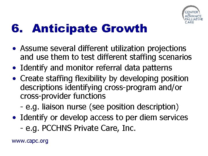 6. Anticipate Growth • Assume several different utilization projections and use them to test different staffing scenarios • Identify and monitor referral data patterns • Create staffing flexibility by developing position descriptions identifying cross-program and/or cross-provider functions - e. g. liaison nurse (see position description) • Identify or develop access to per diem services - e. g. PCCHNS Private Care, Inc. www. capc. org