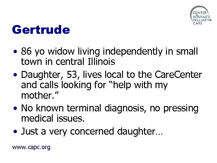 Gertrude • 86 yo widow living independently in small town in central Illinois • Daughter, 53, lives local to the Care. Center and calls looking for “help with my mother. ” • No known terminal diagnosis, no pressing medical issues. • Just a very concerned daughter… www. capc. org