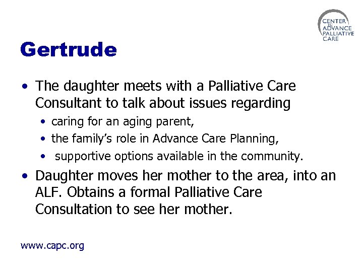 Gertrude • The daughter meets with a Palliative Care Consultant to talk about issues regarding • caring for an aging parent, • the family’s role in Advance Care Planning, • supportive options available in the community. • Daughter moves her mother to the area, into an ALF. Obtains a formal Palliative Care Consultation to see her mother. www. capc. org