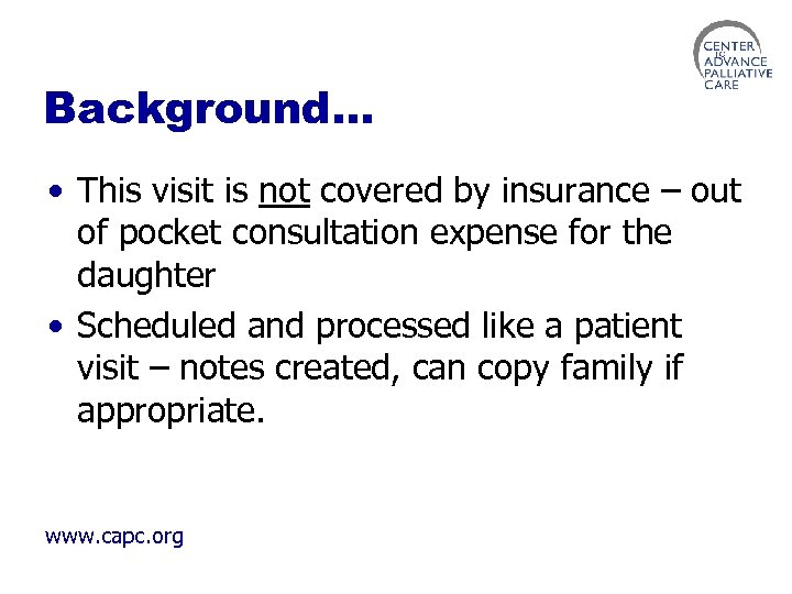 Background… • This visit is not covered by insurance – out of pocket consultation expense for the daughter • Scheduled and processed like a patient visit – notes created, can copy family if appropriate. www. capc. org