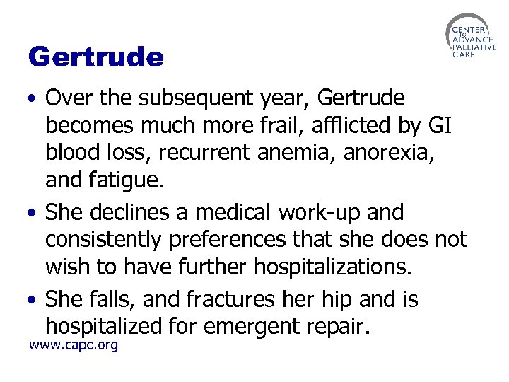 Gertrude • Over the subsequent year, Gertrude becomes much more frail, afflicted by GI blood loss, recurrent anemia, anorexia, and fatigue. • She declines a medical work-up and consistently preferences that she does not wish to have further hospitalizations. • She falls, and fractures her hip and is hospitalized for emergent repair. www. capc. org