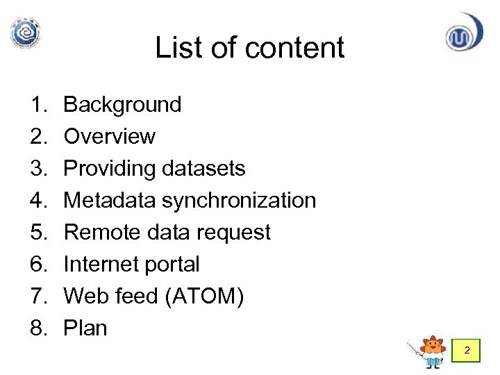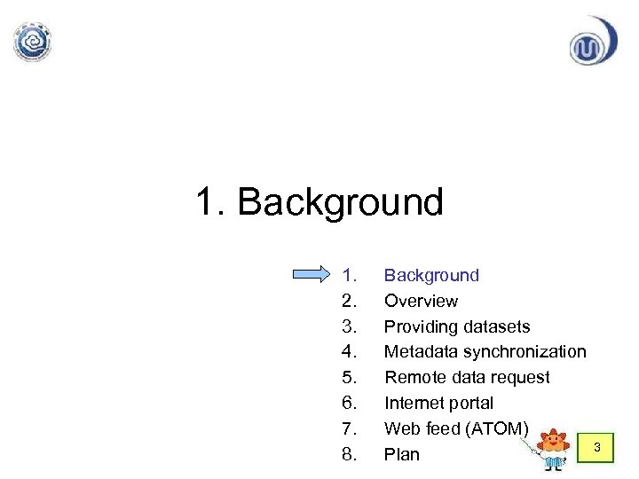 1. Background 1. 2. 3. 4. 5. 6. 7. 8. Background Overview Providing datasets Metadata synchronization Remote data request Internet portal Web feed (ATOM) Plan 3