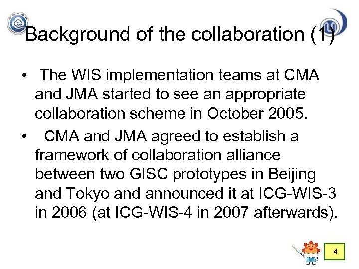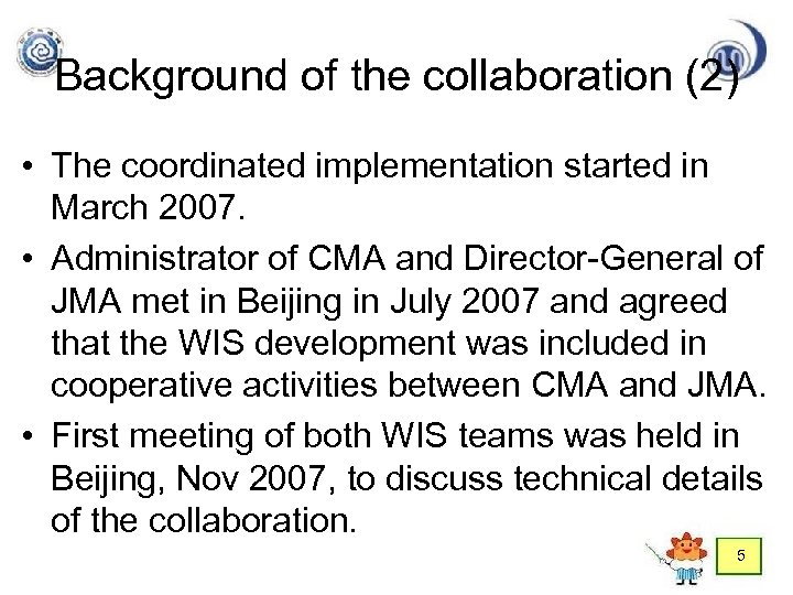 Background of the collaboration (1) • The WIS implementation teams at CMA and JMA started to see an appropriate collaboration scheme in October 2005. • CMA and JMA agreed to establish a framework of collaboration alliance between two GISC prototypes in Beijing and Tokyo and announced it at ICG-WIS-3 in 2006 (at ICG-WIS-4 in 2007 afterwards). 4