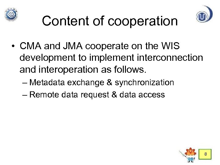 Content of cooperation • CMA and JMA cooperate on the WIS development to implement interconnection and interoperation as follows. – Metadata exchange & synchronization – Remote data request & data access 8