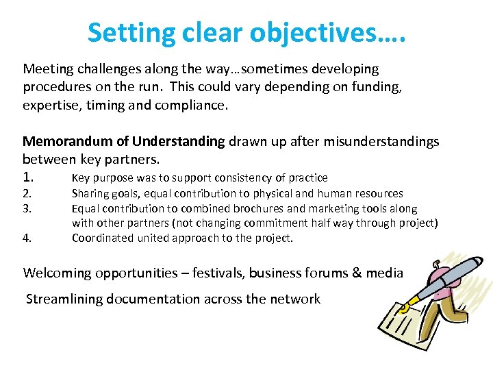 Setting clear objectives…. Meeting challenges along the way…sometimes developing procedures on the run. This could vary depending on funding, expertise, timing and compliance. Memorandum of Understanding drawn up after misunderstandings between key partners. 1. Key purpose was to support consistency of practice 2. 3. 4. Sharing goals, equal contribution to physical and human resources Equal contribution to combined brochures and marketing tools along with other partners (not changing commitment half way through project) Coordinated united approach to the project. Welcoming opportunities – festivals, business forums & media Streamlining documentation across the network