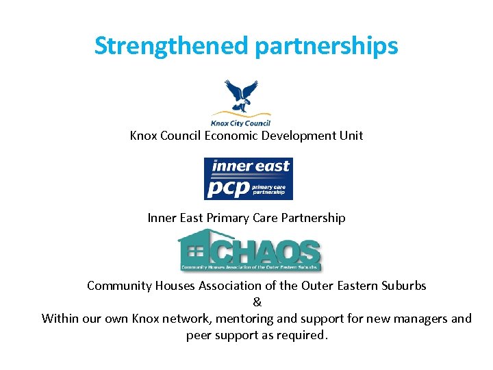 Strengthened partnerships Knox Council Economic Development Unit Inner East Primary Care Partnership Community Houses Association of the Outer Eastern Suburbs & Within our own Knox network, mentoring and support for new managers and peer support as required.
