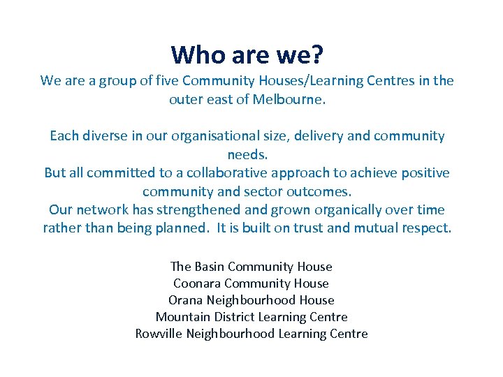 Who are we? We are a group of five Community Houses/Learning Centres in the outer east of Melbourne. Each diverse in our organisational size, delivery and community needs. But all committed to a collaborative approach to achieve positive community and sector outcomes. Our network has strengthened and grown organically over time rather than being planned. It is built on trust and mutual respect. The Basin Community House Coonara Community House Orana Neighbourhood House Mountain District Learning Centre Rowville Neighbourhood Learning Centre