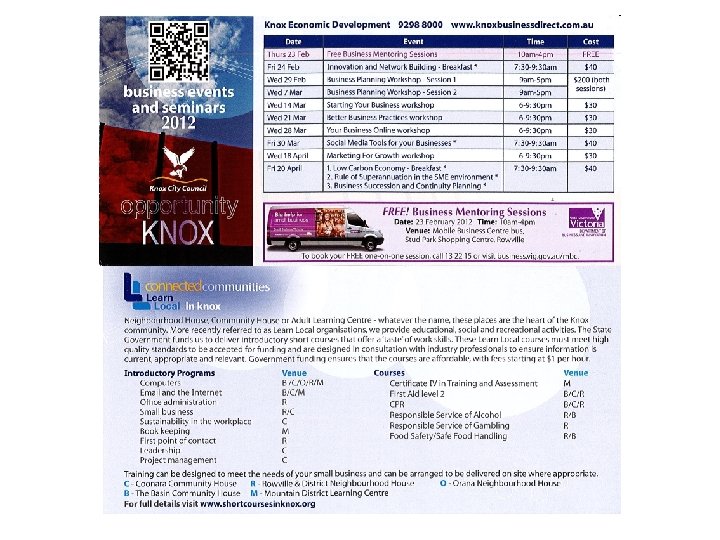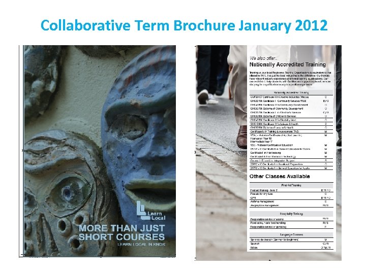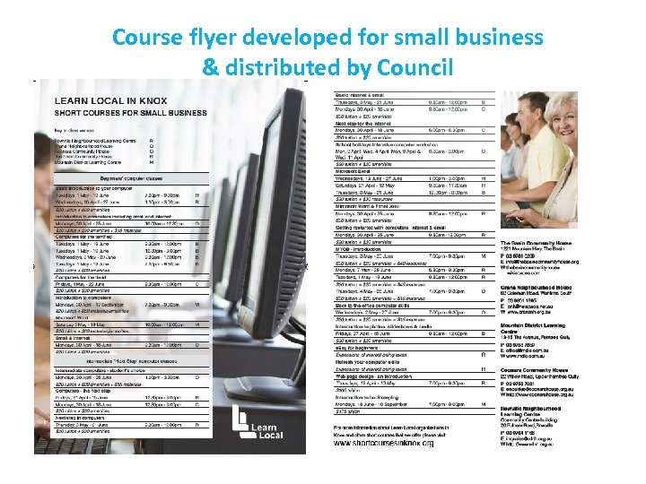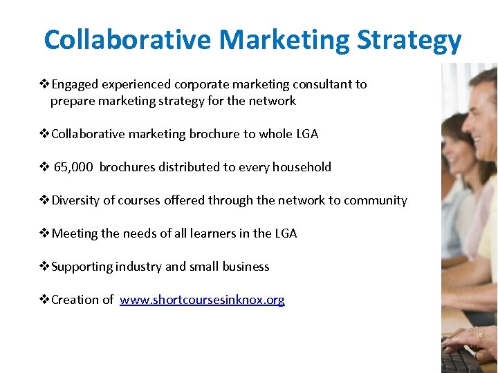 Collaborative Marketing Strategy v. Engaged experienced corporate marketing consultant to prepare marketing strategy for the network v. Collaborative marketing brochure to whole LGA v 65, 000 brochures distributed to every household v. Diversity of courses offered through the network to community v. Meeting the needs of all learners in the LGA v. Supporting industry and small business v. Creation of www. shortcoursesinknox. org