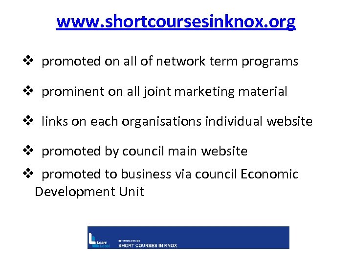www. shortcoursesinknox. org v promoted on all of network term programs v prominent on all joint marketing material v links on each organisations individual website v promoted by council main website v promoted to business via council Economic Development Unit
