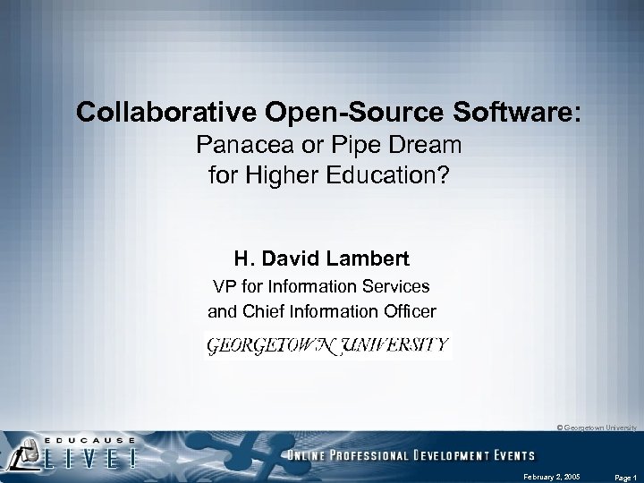 Collaborative Open-Source Software: Panacea or Pipe Dream for Higher Education? H. David Lambert VP for Information Services and Chief Information Officer © Georgetown University February 2, 2005 Page 1