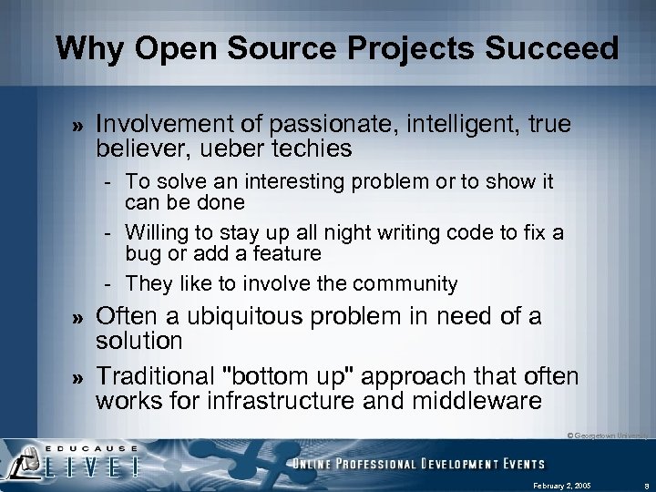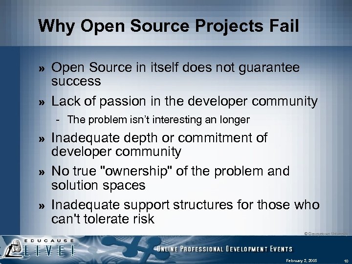 Why Open Source Projects Fail » » Open Source in itself does not guarantee success Lack of passion in the developer community - The problem isn’t interesting an longer » » » Inadequate depth or commitment of developer community No true "ownership" of the problem and solution spaces Inadequate support structures for those who can't tolerate risk © Georgetown University February 2, 2005 10