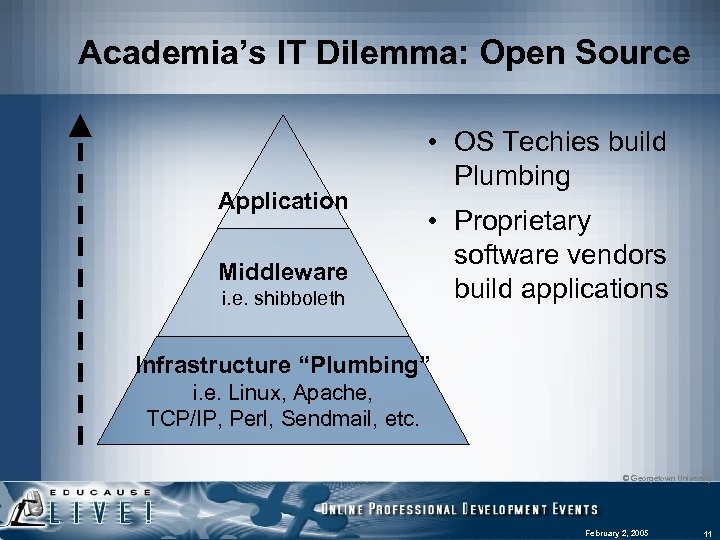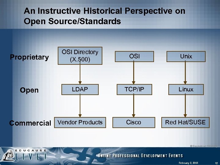 Academia’s IT Dilemma: Open Source Application Middleware i. e. shibboleth • OS Techies build Plumbing • Proprietary software vendors build applications Infrastructure “Plumbing” i. e. Linux, Apache, TCP/IP, Perl, Sendmail, etc. © Georgetown University February 2, 2005 11
