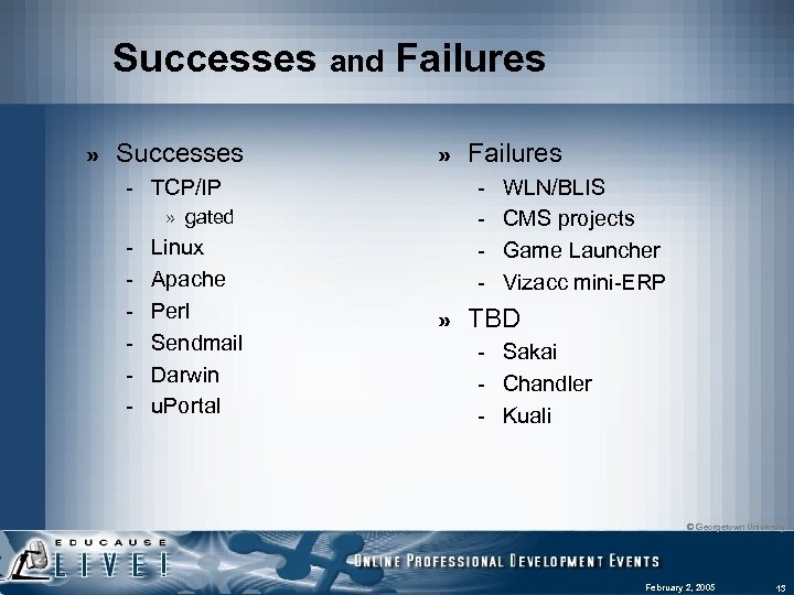Successes and Failures » Successes » - TCP/IP - » gated - Linux Apache Perl Sendmail Darwin u. Portal Failures » WLN/BLIS CMS projects Game Launcher Vizacc mini-ERP TBD - Sakai - Chandler - Kuali © Georgetown University February 2, 2005 13