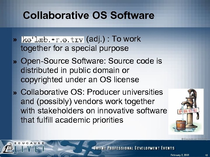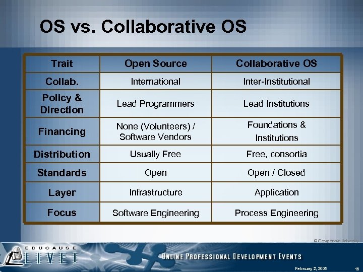 Collaborative OS Software » (adj. ) : To work together for a special purpose » Open-Source Software: Source code is distributed in public domain or copyrighted under an OS license » Collaborative OS: Producer universities and (possibly) vendors work together with stakeholders on innovative software that fulfill academic priorities © Georgetown University February 2, 2005 15