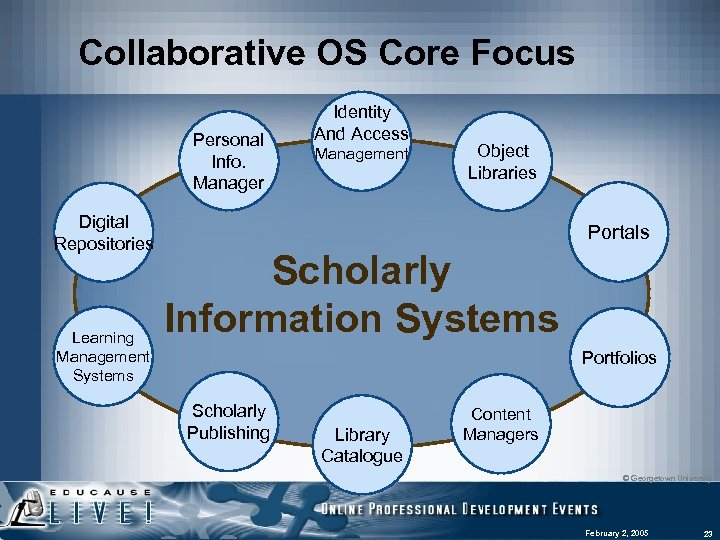 Collaborative OS Core Focus Personal Info. Manager Digital Repositories Learning Management Systems Identity And Access Management Object Libraries Portals Scholarly Information Systems Portfolios Scholarly Publishing Library Catalogue Content Managers © Georgetown University February 2, 2005 23