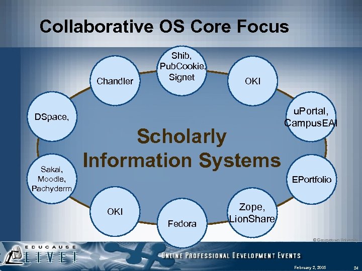 Collaborative OS Core Focus Chandler Shib, Pub. Cookie, Signet OKI DSpace, Sakai, Moodle, Pachyderm Scholarly Information Systems u. Portal, Campus. EAI EPortfolio OKI Fedora Zope, Lion. Share © Georgetown University February 2, 2005 24