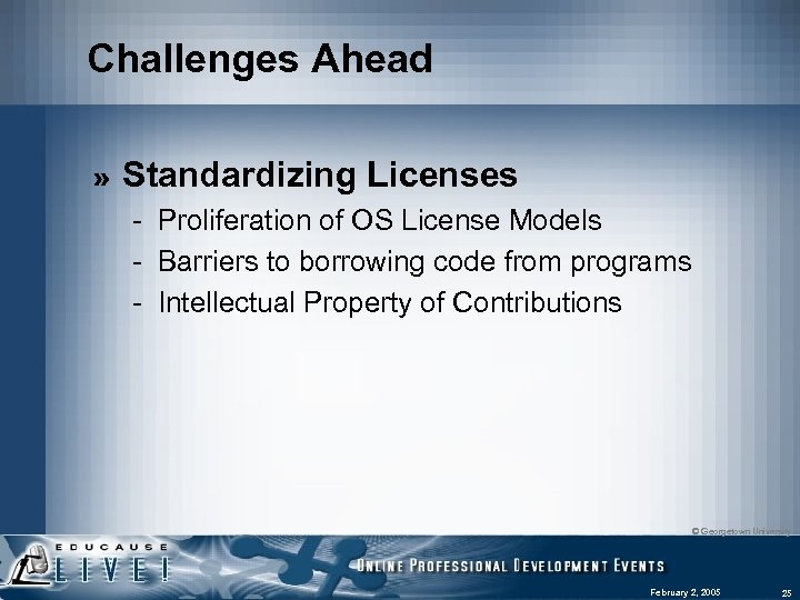 Challenges Ahead » Standardizing Licenses - Proliferation of OS License Models - Barriers to borrowing code from programs - Intellectual Property of Contributions © Georgetown University February 2, 2005 25