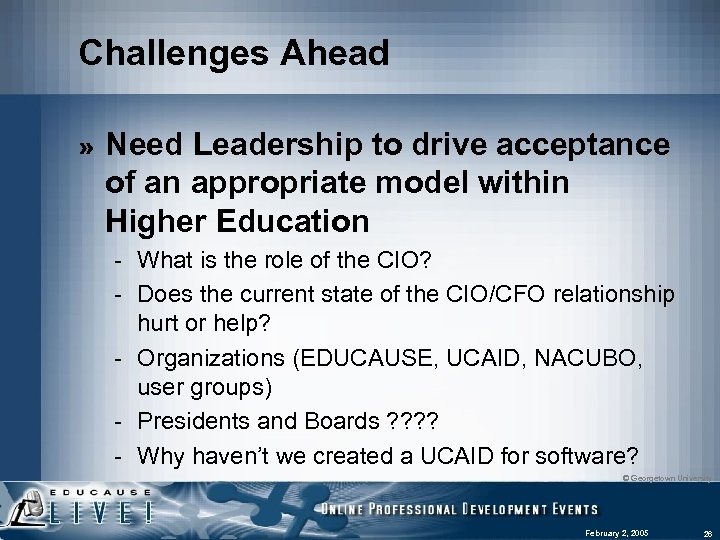 Challenges Ahead » Need Leadership to drive acceptance of an appropriate model within Higher Education - What is the role of the CIO? - Does the current state of the CIO/CFO relationship hurt or help? - Organizations (EDUCAUSE, UCAID, NACUBO, user groups) - Presidents and Boards ? ? - Why haven’t we created a UCAID for software? © Georgetown University February 2, 2005 26