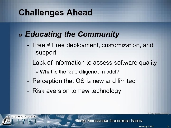 Challenges Ahead » Educating the Community - Free ≠ Free deployment, customization, and support - Lack of information to assess software quality » What is the ‘due diligence’ model? - Perception that OS is new and limited - Risk aversion to new technology © Georgetown University February 2, 2005 27