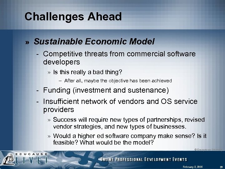 Challenges Ahead » Sustainable Economic Model - Competitive threats from commercial software developers » Is this really a bad thing? – After all, maybe the objective has been achieved - Funding (investment and sustenance) - Insufficient network of vendors and OS service providers » Success will require new types of partnerships, revised vendor strategies, and new types of businesses. » Would a higher ed software company make sense? Is it feasible? What would be the model? © Georgetown University February 2, 2005 28