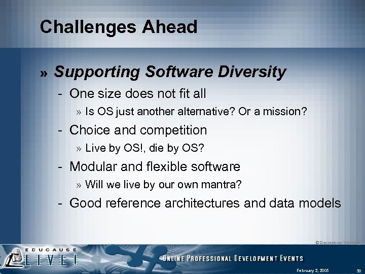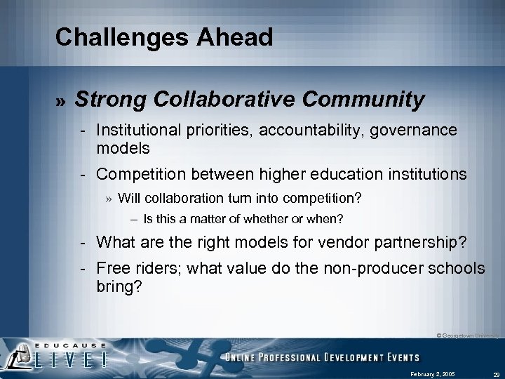 Challenges Ahead » Strong Collaborative Community - Institutional priorities, accountability, governance models - Competition between higher education institutions » Will collaboration turn into competition? – Is this a matter of whether or when? - What are the right models for vendor partnership? - Free riders; what value do the non-producer schools bring? © Georgetown University February 2, 2005 29