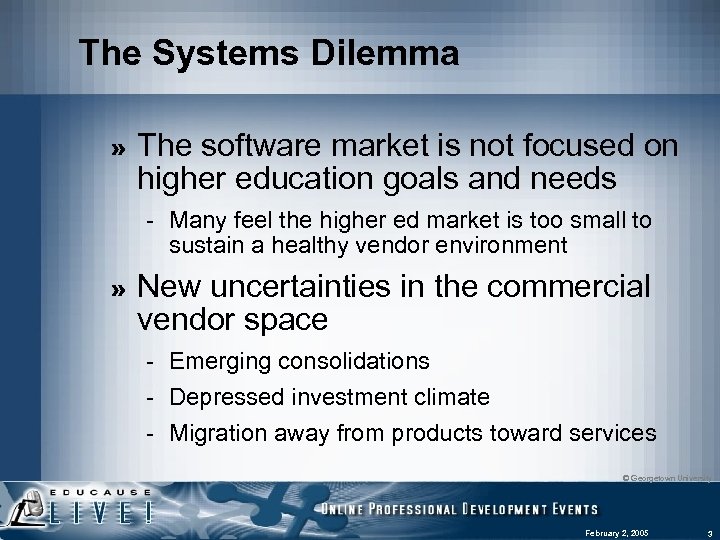 The Academy’s Systems Dilemma » Higher Education is in dire need of a sustainable, affordable software model » Buy vs. Build model has failed - We’ve been unable to build our own for quite some time » Most locally built applications are being replaced - Vendors don’t meet all our requirements and force us to modify code or build workaround code © Georgetown University February 2, 2005 2
