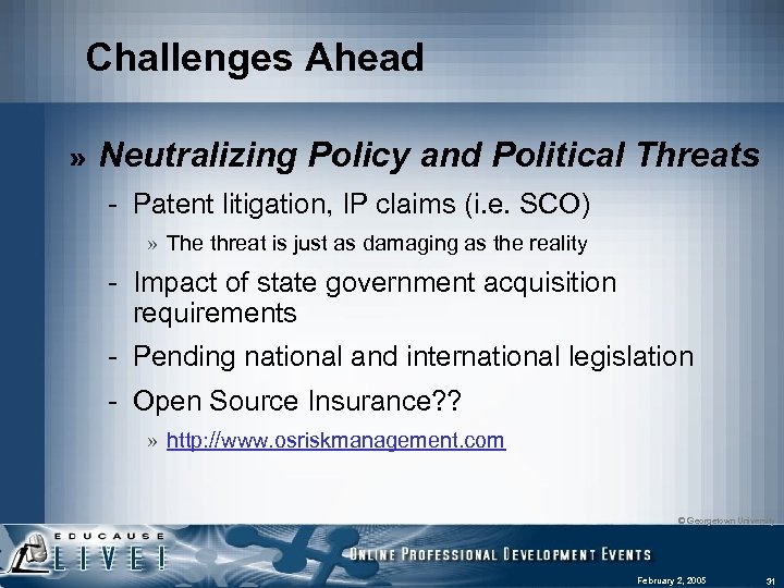 Challenges Ahead » Neutralizing Policy and Political Threats - Patent litigation, IP claims (i. e. SCO) » The threat is just as damaging as the reality - Impact of state government acquisition requirements - Pending national and international legislation - Open Source Insurance? ? » http: //www. osriskmanagement. com © Georgetown University February 2, 2005 31
