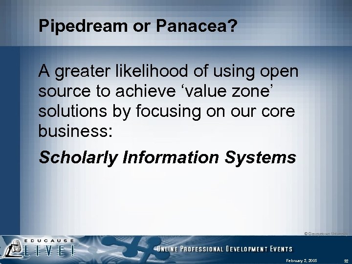 Pipedream or Panacea? A greater likelihood of using open source to achieve ‘value zone’ solutions by focusing on our core business: Scholarly Information Systems © Georgetown University February 2, 2005 32